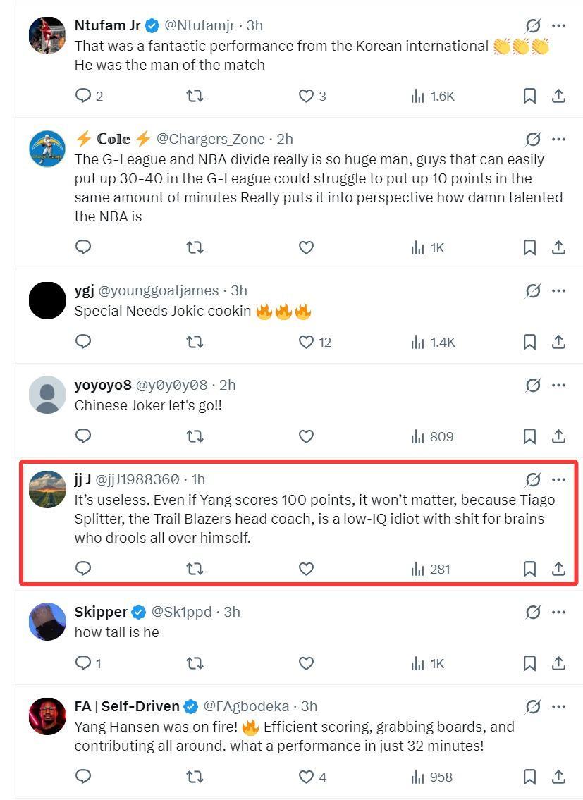 但有一位开拓者球迷写道:没用的,就算杨瀚森在G联赛拿到100分也没用,因为开拓者主帅斯普利特是一个低智商、愚蠢的主帅,他不会给杨瀚森机会的。