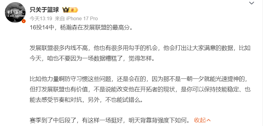 实际上这场比赛后,杨瀚森在G联赛场均29.4分钟,拿到19.3分9.7篮板3.3助攻0.9抢断1.2盖帽,命中率66.7%,三分命中率36.4%,这个数据真的不差。